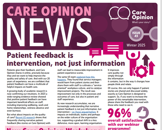 This is one of my favorite newsletters to date winternewsletter2025.pdf with lots of interesting topics covering information around workshops, webinars and research. Academic research is now confirming Care Opinion intuitions. In 2023 a wide-ranging evidence review showed that positive patient feedback can have important beneficial effects on staff, including improving wellbeing, work and home relationships, sickness absence and even burnout.